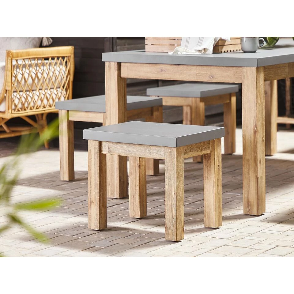 Buitenkruk met een betonlook zitting. Als je houdt van een industriële stijl en buiten dineren, dan is deze kruk zeker iets voor jou. De tuinkruk combineert perfect de stoere uitstraling van de een betonlook zitting van vezelcement met een houten onderstel. Het sterke en stevige acaciahout in natuurlijke afwerking garandeert duurzaamheid en biedt tegelijkertijd de klassieke, natuurlijke uitstraling. Deze veelzijdige tuinkruk is een prachtige aanvulling op vrijwel elke buitenruimte, van een klein balkon tot een grote tuin. Combineer het met een bijpassende tafel en creëer de perfecte setting voor jouw buitenfeesten.