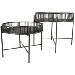 Bent u op zoek naar een eenvoudige manier om meer sfeer in uw interieur te creëren? Dan is bijzettafelset Aiko uit de collectie van het woonmerk Les een perfecte keuze! Deze trendy set bestaat uit twee tafeltjes met verschillende afmetingen, welke op een speelse manier bij elkaar geplaatst kunnen worden. Beide exemplaren zijn uitgerust met een subtiel metalen onderstel met een zwarte kleur als afwerking. Op elk onderstel rust een rond tafelblad met een opstaande rand, welke is uitgevoerd in zwart bamboe. Plaats bijzettafel Aiko in de woonkamer of hal, maar gebruik hem ook om de tuinkamer of ruimte onder de veranda een nieuwe look te geven. Tevens verkrijgbaar in het naturel. Afmetingen B49xD49xH39.50 cm. B60xD60xH49 cm.
