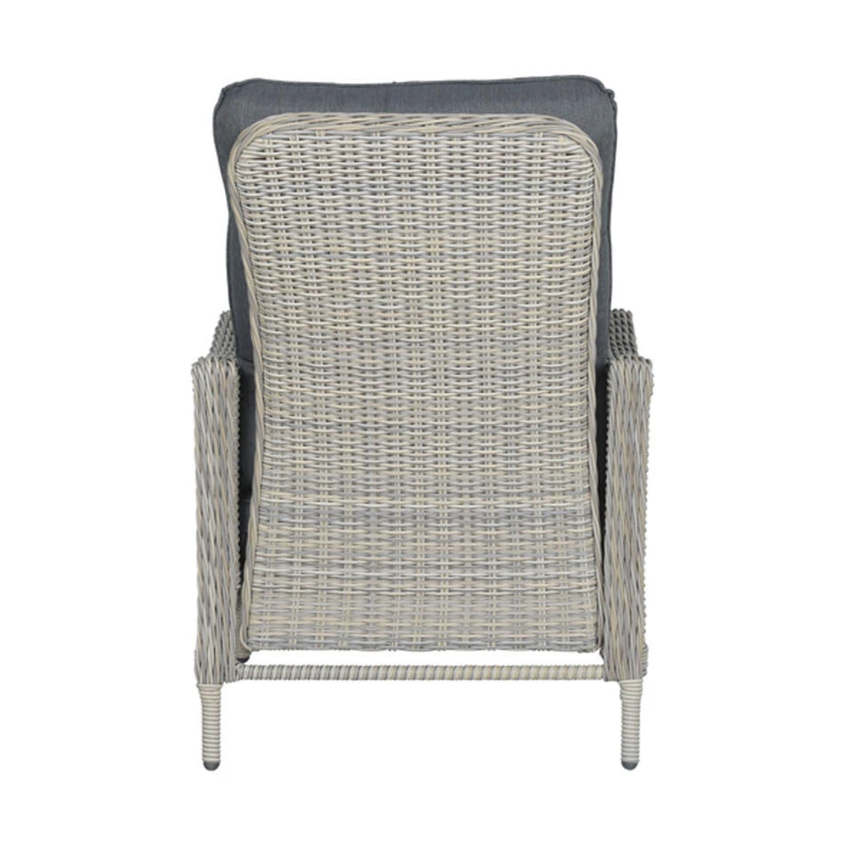 Heerlijk wegdromen kun je zeker in de Nova verstelbare tuinstoel. Met deze stoel kun je alle kanten op. Of je nu een goed boek wilt lezen, lekker wilt zonnen of gewoon buiten dineren, het kan allemaal! De Nova verstelbare stoel wordt compleet geleverd met dik zit- en rugkussen. Dat je heerlijk kunt wegdromen in deze stoel, dat zie je direct, maar deze stoel is daarnaast ook vervaardigd uit hoogwaardige kwaliteit materialen. De stoel is vervaardigd uit een onderhoudsvrij aluminium frame en weerbestendig half rond wicker kunststof vlechtwerkdraad in de kleur vintage willow. Het draad heeft een dikte van maar liefst 5mm, wat zorgt voor een robuuste uitstraling. Wicker is een stevig en duurzaam kunststof, waardoor je jarenlang kunt genieten van de Nova verstelbare tuinstoel. Het zit- en rugkussen is gemaakt van een hoogwaardige kwaliteit polyester. Het zitkussen is voorzien van een rits, waardoor het hoesje gemakkelijk met de hand gewassen kan worden. De rugkussens zijn voorzien van extra stiksels waarmee de stof op twee plekken naar elkaar wordt getrokken, wat zorgt voor een klassieke uitstraling. Deze stijlvolle look is geïnspireerd op de bekende klassieke chesterfield banken. De kussens zijn niet 100% waterdicht, maar zijn wel voorzien van een waterafstotende coating. Dit is vooral erg praktisch als er bijvoorbeeld op het kussen wordt gemorst met drinken. Je veegt het vocht er namelijk gemakkelijk weer af. Na gebruik kunnen de kussens opgeborgen worden in de schuur of een mooie kussenbox. Deze Nova stoel is traploos verstelbaar (d.m.v. een gasveer), waardoor je gemakkelijk de rugleuning in iedere gewenste positie kunt zetten.Voor behoud van de gasveer is er gebruik gemaakt van een koker met kunststof sluitingsranden om de gasveer. Dit voorkomt dat er zomaar vocht bij de gasveer kan komen. Uiteraard kan door de jaren heen er wel wat vocht bij komen. Om dit zoveel mogelijk te beperking wordt er aangeraden om de stoelen bij nat of vochtig weer af te dekken met een passende beschermhoes. De verstelbare Nova stoel kun je los aanschaffen, maar past ook perfect bij de andere tuinmeubelen uit de Nova serie. Zo combineer je deze stoel bijvoorbeeld met de Nova dining tafel of met een complete hoekbank opstelling. De nova meubels zijn leverbaar in diverse kleurstellingen. De afmetingen van deze stoel zijn: B 72 x D 77 x H 85 cm.