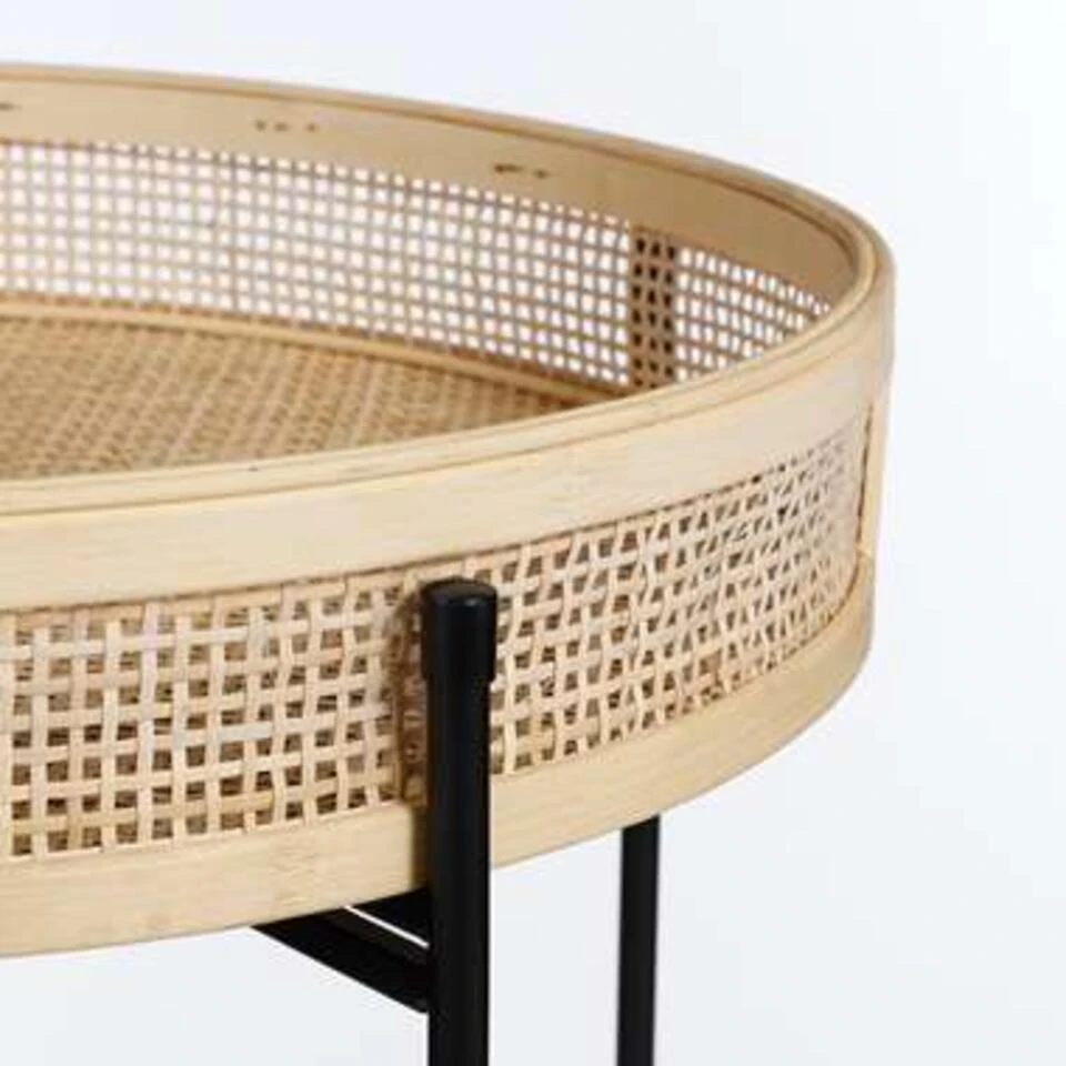 Op zoek naar een leuke bijzettafel voor op het terras of balkon? De Leandro tuintafeltjes van Mica Decorations passen door de neutrale uitstraling overal bij. Het frame is gemaakt van zwart metaal en biedt ondersteuning aan een rond blad van bamboe en rotan. Een mooie combinatie! Door de hoge rand kun je alles daarnaast veilig neerzetten, bijvoorbeeld een paar drankjes of wat leuke decoraties. De set bestaat uit twee tafeltjes die je precies onder elkaar kunt schuiven. Zo kun je, als het nodig is, van alles erop kwijt. De afmetingen van de ronde bijzettafels zijn H42,5 x Ø35 cm en H53 x Ø45 cm.