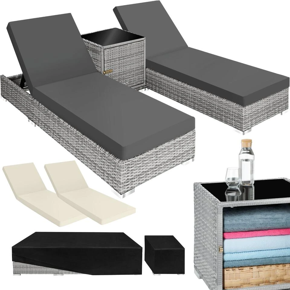 Deze mooie set bestaat uit 2 ligbedden met een bijzettafel. En is perfect om te relaxen en te ontspannen in de tuin of op het terras. Misstaat ook zeker niet op een balkon of in de sauna. Uitgerust met beige en grijze kussenhoezen, hiermee kunt u in een handomdraai de set van uiterlijk doen veranderen. De mooie bijzettafel, heeft een donkere glazen plaat en geeft u de mogelijkheid om bijvoorbeeld zonnebrandcreme of handdoeken op te bergen.