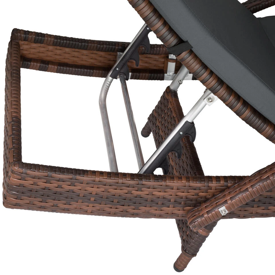 Met de functionele wicker zonnestoel van tectake ben je tijdens het warme seizoen altijd optimaal uitgerust. De stijlvolle en moderne constructie wordt gekenmerkt door haat aantrekkelijke design en haar hoge ligcomfort. Met de 5-voudig verstelbare rugleuning, het zachte kussen en de praktische armleuningen vind je altijd de ideale positie voor maximale ontspanning. Het duurzame vlechtwerk van polyrattan en het robuuste frame van aluminium maken dit lichte en roestvrije garnituur tot het perfecte outdoor meubel. De knusse zonnestoel van tectake stelt zich perfect op jou in.
