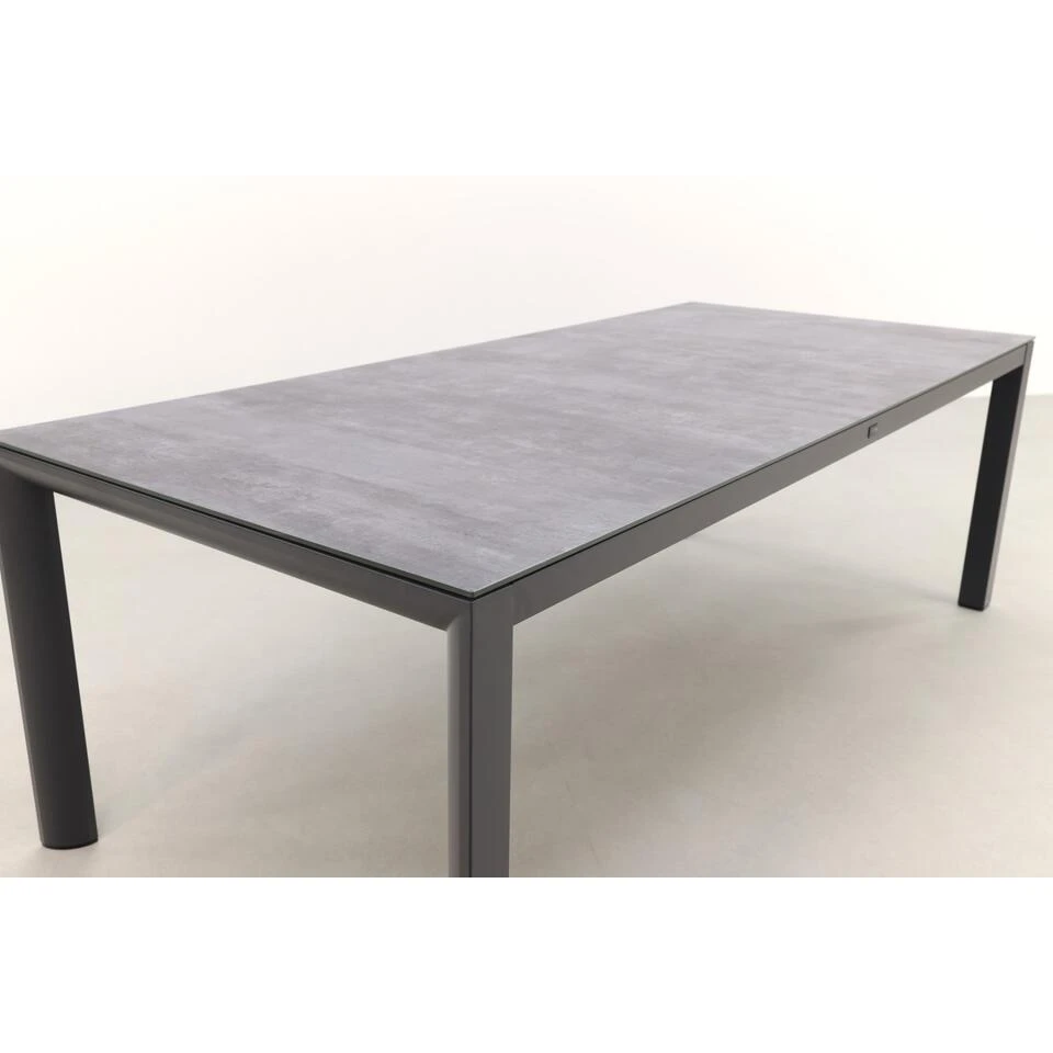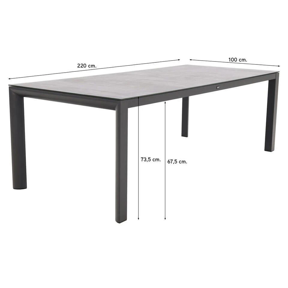 Het frame van de Baltimor dining tuintafel is gemaakt van aluminium. Dit materiaal is super sterk, heeft weinig onderhoud nodig en kan niet verroesten. Voor extra bescherming is het frame afgewerkt met een antracietkleurige coating welke kras- en stootvast is. Onder de tafelpoten zitten verstelbare dopjes zodat je de tafel waterpas af kunt stellen. Het tafelblad van de Baltimor dining tuintafel is gemaakt van “ceramic on glass”. Dit is een keramiek laagje dat op een geharde glasplaat is aangebracht. Dit materiaal is krasvast en eenvoudig in onderhoud. Schoonmaken met een vochtig doekje volstaat. Daarnaast is het blad hitte- en uv-bestendig.Â